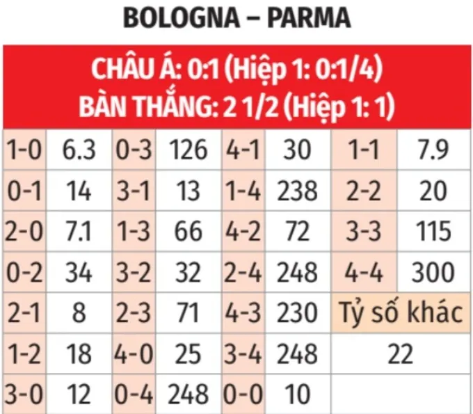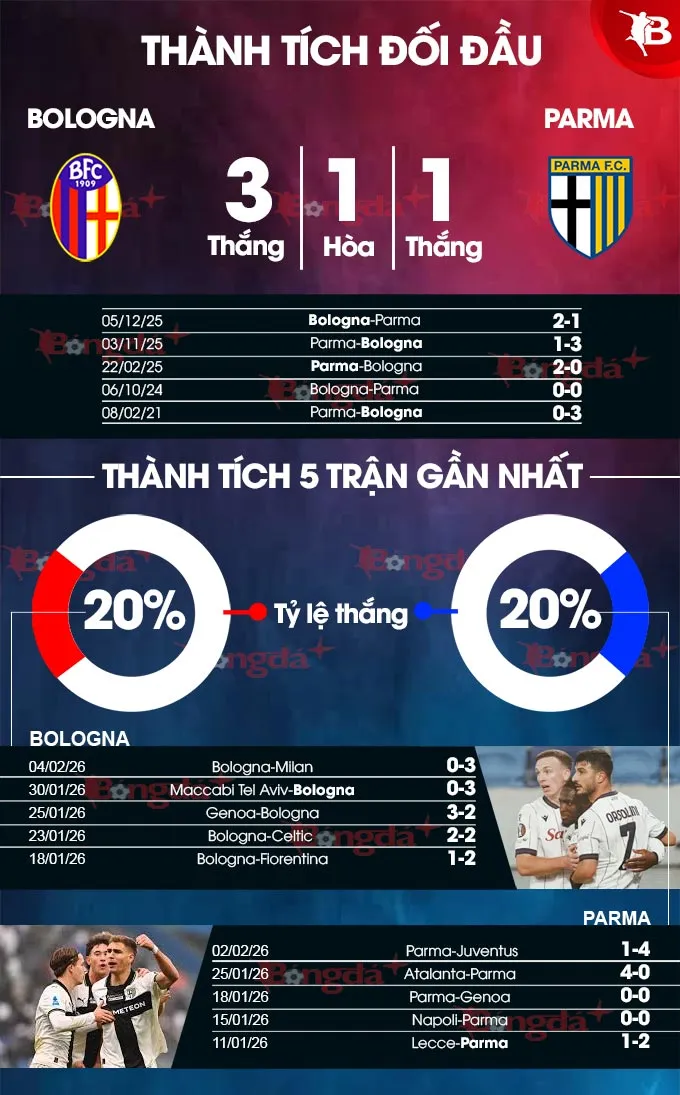 Sức mạnh sân khách của Parma là điểm sáng. Trong 6 chuyến làm khách gần nhất, họ chỉ thua 1, hòa 2 và thắng tới 3 trận. Với hành trang này, Parma hoàn toàn có thể nuôi tham vọng rời sân Bologna với ít nhất một điểm.