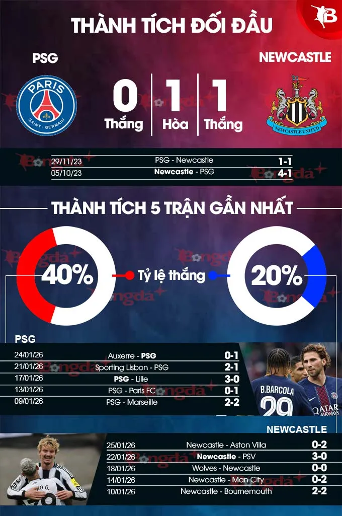 Lịch sử đối đầu với các đội bóng Pháp cũng không ủng hộ Newcastle. Họ đã thua 7 trong tổng số 14 lần gặp mặt, với 5 trong số đó diễn ra ngay trên đất Pháp. Thách thức tại Parc des Princes lần này là rất lớn.