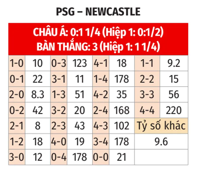 - Hiệp 1 ít bàn thắng: Các trận đấu gần đây của cả hai đội thường có hiệp 1 khép lại với tối đa 1 bàn. 7/8 trận của PSG và 5/7 trận của Newcastle tuân theo kịch bản này.